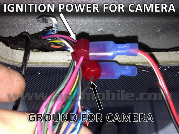 Camera power connections: IGNITION is the pink wire in Pin 13 and GROUND is the black wire in Pin 8: