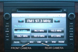 | If you already have a rear camera, the easiest way to display the front camera on the GM-1210 is to simply plug it into the yellow AV2 input video RCA, then simply activate the AV2 source button on the main menu and you will have access to the front and rear cameras from the menu bar at any time: | ![]() |