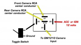 | If you are using the AV2 input for another source like rear headrest input or a CRUX WVI, then the easiest way to display the front camera will be use a switch to toggle the rear camera input between the front and rear cameras. This can accomplished using a toggle switch and a standard relay as shown (BELOW LEFT).