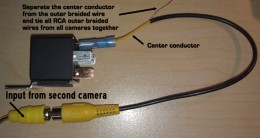 In this arrangement, with the relay at rest, pins 30 and 87A are connected, leaving the rear camera connected to the rear camera input on the GM-1210 as it would normally operate. When the switch is flipped, the relay turns on and you are now connecting pins 30 and 87, sending the front (or second) camera’s video output to the rear camera input of the deck, allowing you to view that camera. All RCA outer wires (usually bare copper) should be twisted together and crimped or soldered. |