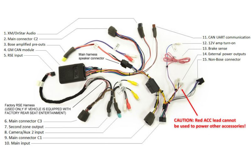 The Main Harness is the large harness that has the foam-wrapped data box attached, as well as multiple connectors that will need to be connected. This harness is used in every installation. The Main Harness Connector C1 (#9 above) will plug into the “X1” factory connector ONLY. The Main Harness Connector C2 (#2 above) will plug into the “X2” factory connector ONLY. However, due to its design, Connector C2 may also slide onto the “X3” and “X4” connectors – THIS WILL RESULT IN LOSS OF XM AND/OR FACTORY REAR ENTERTAINMENT. In the image above, the Main Harness is shown as configured for a Bose system installation (#3), but as it ships from the factory, it is ready to plug and play into a non-Bose system. If you have a Bose system, it needs to be configured as shown above using the PP-GM1210-8 harness. The black XM/OnStar audio connector (#1) will plug into the BLACK port on the GM-1210 and the CAN/UART Connector (#11) will plug into the BROWN port on the GM-1210 CAUTION:The External Power Outputs (#14) may be used to provide a fused constant 12V source (yellow) and ground (black), but the RED lead cannot support a draw of more than 500ma and cannot be used as an accessory source of power! DO NOT HOOK ANY ACCESSORIES SUCH AS A CAMERA OR REAR ENTERTAINMENT TO THE SHORT RED LEAD! UNPREDICTABLE OPERATION AND/OR SYSTEM FAILURE WILL RESULT! THIS WILL NOT BE COVERED UNDER WARRANTY! |