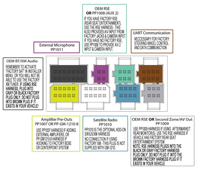 This harness is for the optional Sirius/XM tuner and is not supplied with the unit – it is only used in a vehicle that DOES NOT have factory XM radio. In a vehicle equipped with factory XM, there are no additional connections required. However, the factory XM tuner option on the GM-1210 is not enabled by default. You must enable the factory XM tuner in the installer menu or you will not be able to choose it as a source! See the “XM TUNER SETTINGS” tab to enable the factory XM tuner. | |