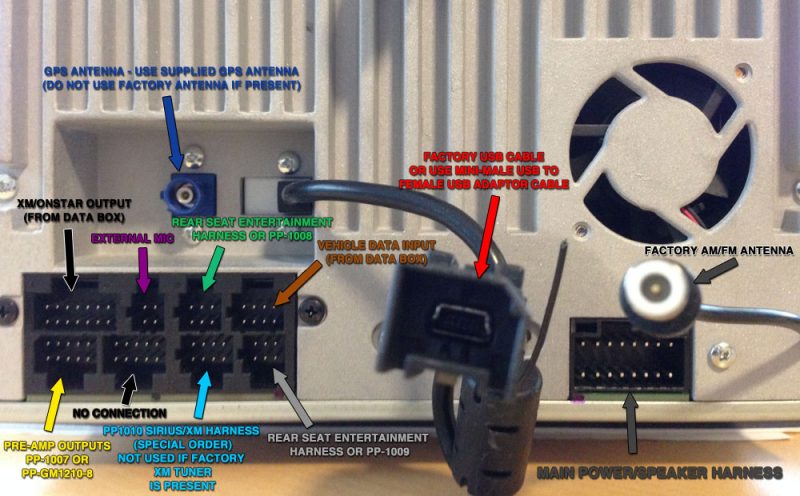 When you remove the factory radio, you will be removing multiple connectors that were plugged into the factory radio. The picture at left shows the most basic plug arrangement possible in a 2010+ GM vehicle with a factory USB jack. If your vehicle does not have a factory USB jack, the USB cable will not be present.Use this photo as a guide for the proper use of the Car Show connectors.