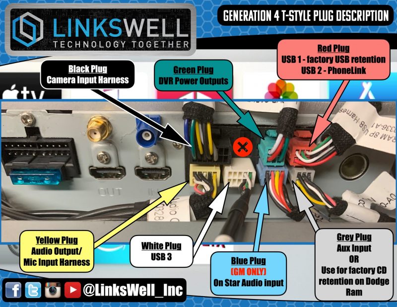 The plugs on the HDMI module will REPLACE the 10-Pin USB (white) and the DVR (green) plugs that are supplied with the radio. Those plugs provided with the radio will not be used.
